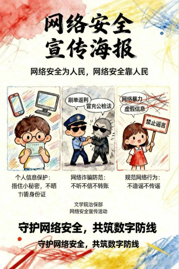 为深入贯彻习近平总书记关于网络强国的重要思想,落实国家网络安全相关法律法规要求,文学院精心策划“绘安全画卷·筑网络防线”网络安全主题海报创作活动,以学生喜闻乐见的艺术形式,强化网络安全素养,推动清朗校园网络环境建设。