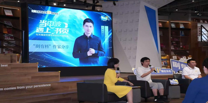活动的重头戏是与“五个一工程”奖获得者天瑞说符的对谈环节。访谈主持董楠与天瑞说符围绕创作心得、未来计划等展开深入交流。天瑞说符作为江西省网络作协副主席,代表作《我们生活在南京》斩获多项大奖,作品还被大英图书馆收录并改编为电影。在近一小时的对谈中,他分享了创作灵感来源及科幻文学的发展趋势,令在场同学受益匪浅。