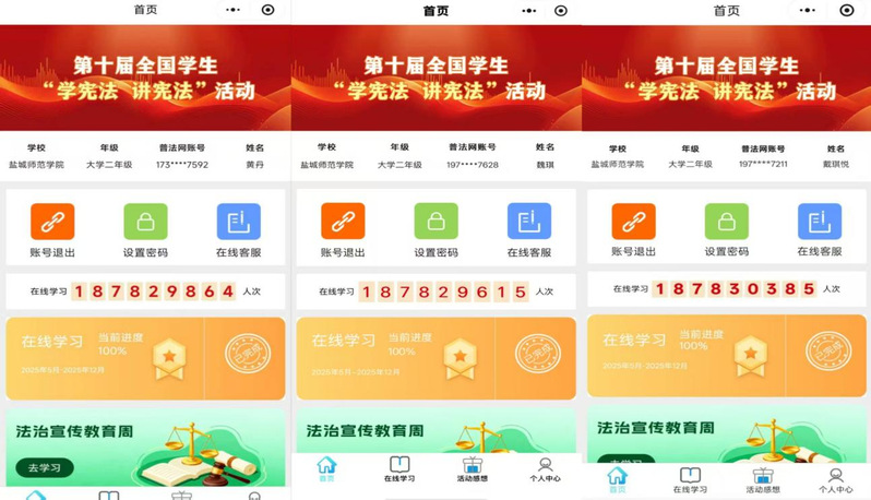 作为活动的重要组成部分,“宪法小卫士”在线学习活动得到了全院学生的积极响应。同学们通过教育部全国青少年普法网等平台,认真学习宪法知识,参与在线答题,“宪法小卫士”学习活动参与率与完成率均达到100%,实现了全员覆盖、全员达标的目标。这一成果充分体现了文学院学子高度的学习自觉性和对宪法学习的重视,也标志着本次系列活动的普法教育目标圆满达成。