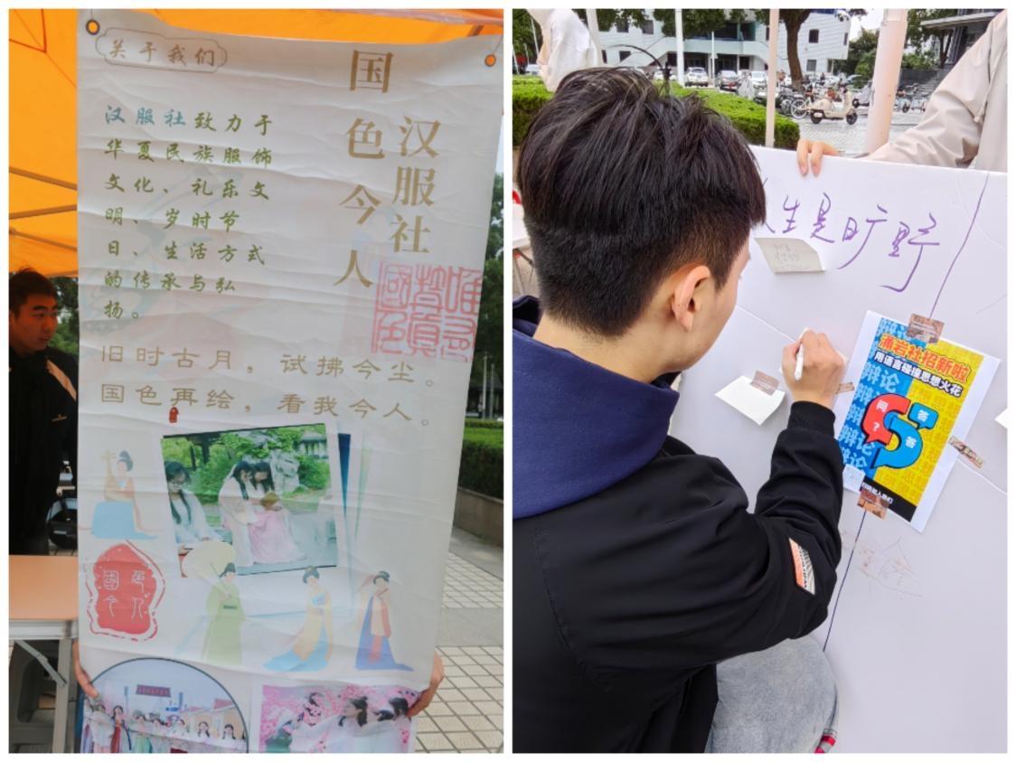 上午九时,活动正式拉开帷幕。现场各社团巧思频出、亮点纷呈,充分展现文学院社团的多元魅力。黄海潮文学社凭借深厚的书香底蕴与饱满的文学热忱,以经典诵读、文稿分享等形式,向热爱文字的学子发出共赴文学山海的邀约;涌岩社创新设置趣味辩论体验区,通过“校园热点模拟辩题”互动环节,生动诠释“以辩会友,以论明志”的社团宗旨,让新生直观感受逻辑思辨的魅力;国色今人汉服社则以传统纹饰展板、礼仪示范等元素营造雅致氛围,一抹古典韵味吸引众多新生驻足咨询、踊跃报名……各类特色活动交织成一幅鲜活的校园文化画卷。