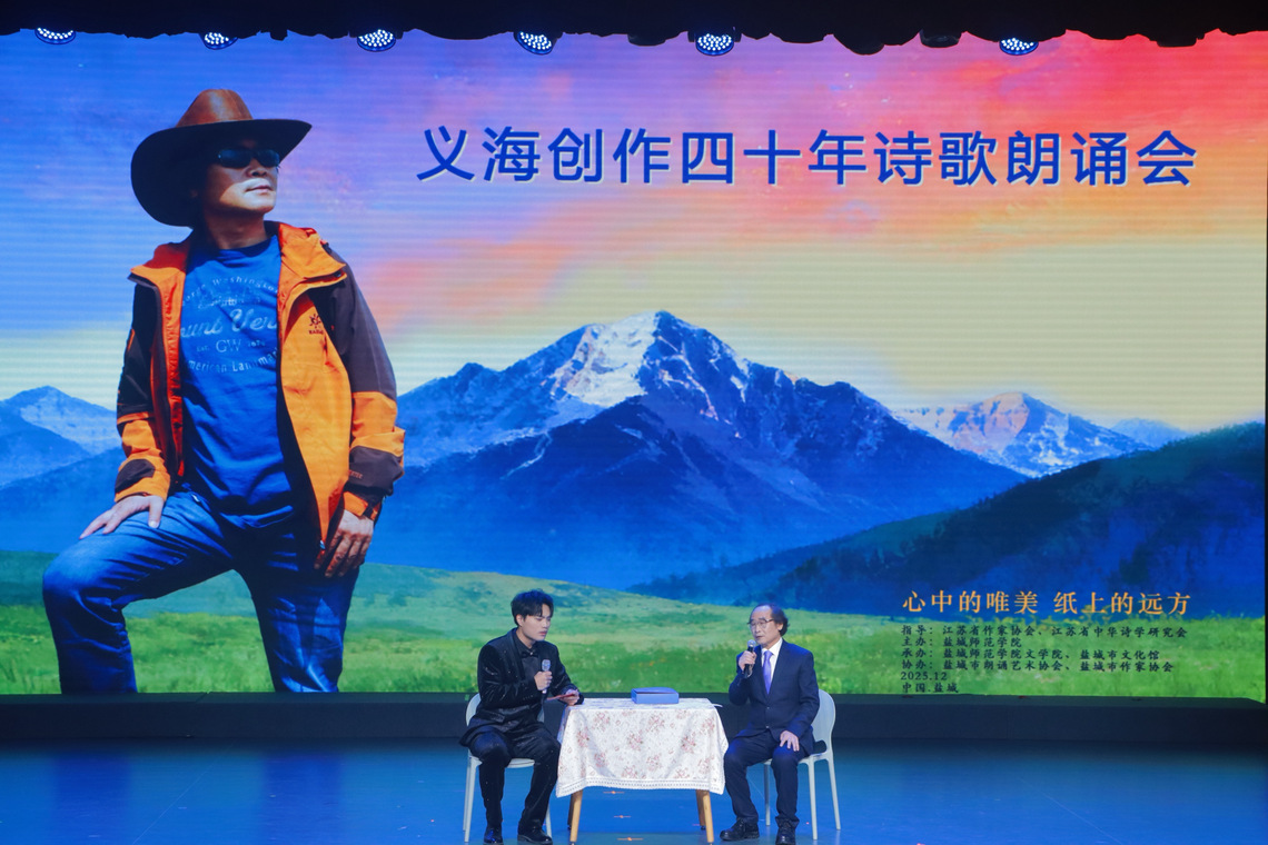 12月14日下午,我校举办的“心中的唯美,纸上的远方——义海创作四十年诗歌朗诵会”在盐城市文化馆群星剧场隆重举行。本次朗诵会由江苏省作家协会、江苏省中华诗学研究会指导,盐城师范学院主办,盐城师范学院文学院、盐城市文化馆承办,盐城市朗诵艺术协会、盐城市作家协会协办,江苏作家作品推广基地具体实施。学校党委书记张玉勤,江苏省作家协会副主席、著名儿童文学作家祁智,学校原党委常委、副校长庞波,盐城市文化馆馆长杨莺,江苏雅家乐集团有限公司董事长蒋刚等出席活动,学校部分职能部门、二级学院领导,文学院师生代表,以及来自全省各地约300名诗歌爱好者参加活动。