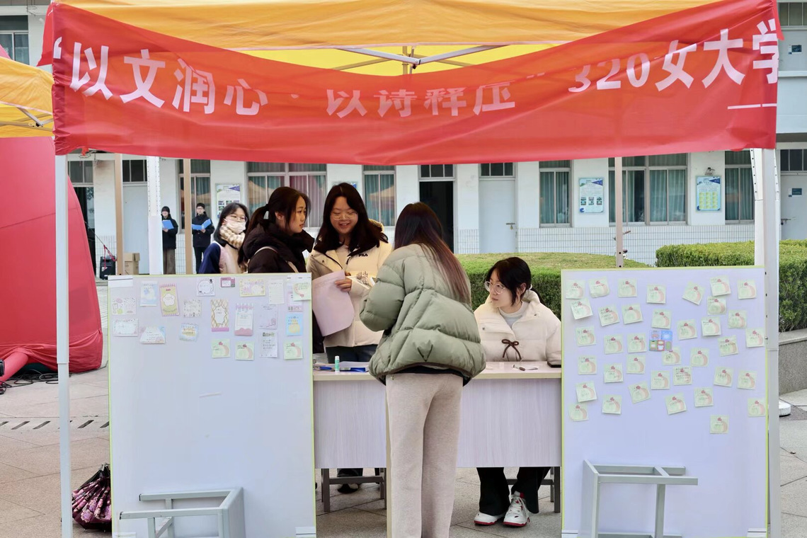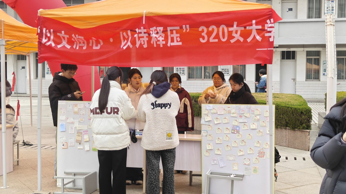 为响应3·20春季心理健康教育号召,落实“以文化人、以文育人”的教育理念,引导学生关注心理健康、学会正向表达与自我调适,3月18日,盐城师范学院文学院在主楼A面广场成功举办了“以文润心·以诗释压”女大学生心理健康周主题活动。本次活动依托文学院专业特色,巧妙融合创意手作与疗愈诗歌朗诵,为全校学生打造了一场沉浸式、体验式的心理减压与艺术疗愈盛宴。