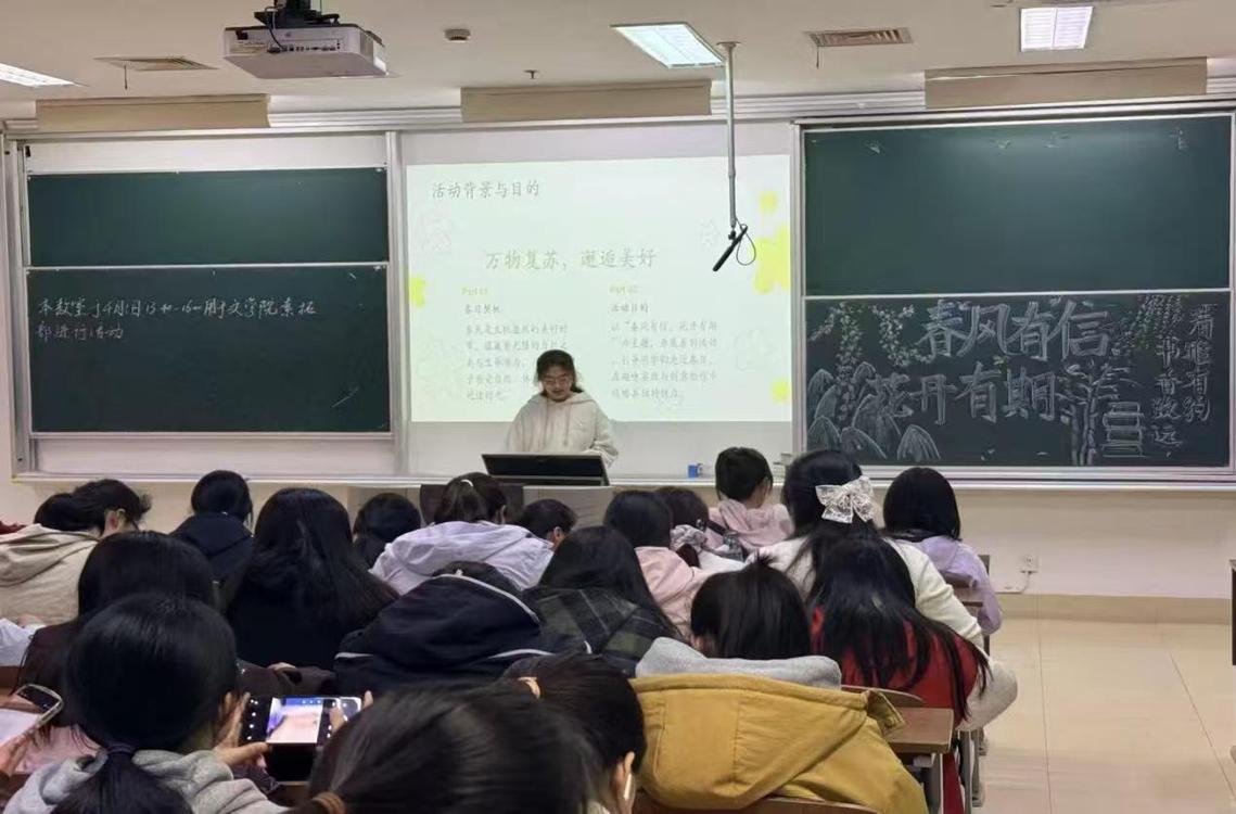 春光明媚,万物复苏,正值文学院学风建设月开展之际,为将春日生机与学风建设相融,引导学子在走近春日自然、体悟生活意趣的同时,厚植勤学善思、笃行创新的学风,近日,盐城师范学院文学院于主楼教室顺利开展“春风有信,花开有期”春日主题活动。全院学子踊跃参与,在创意互动与趣味体验中邂逅春日美好,让青春活力、春日生机与优良学风同频共振。